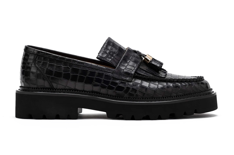 Step into sophistication with the Marc Nolan Journey Black Croc Leather Lug Tassel Loafer. Crafted from black crocskin embossed calf leather, this loafer exudes luxury and style, making it a standout addition to any wardrobe. The gold trim tassel adds a touch of elegance, while the rubber lug sole ensures durability and grip for various occasions. Inside, the full calf leather lining and latex memory foam insole provide all-day comfort, making it as practical as it is stylish. Perfect for both casual and formal settings, this loafer seamlessly blends classic design with modern features. Grab your pair here.