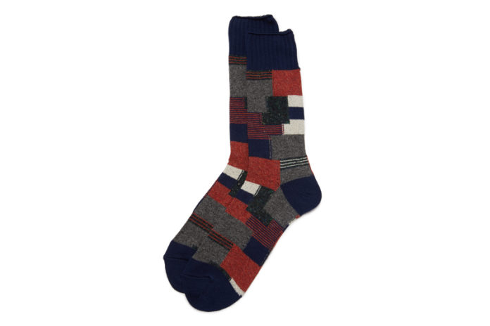 Anonymous Ism adds some flair to your sock game with this colorful pattern. Imported from Japan, the socks feature elasticized ribbing at the shin and a cotton and acrylic blend. The patchwork design consists of a variety of colors including navy and orange. Available at East Dane.