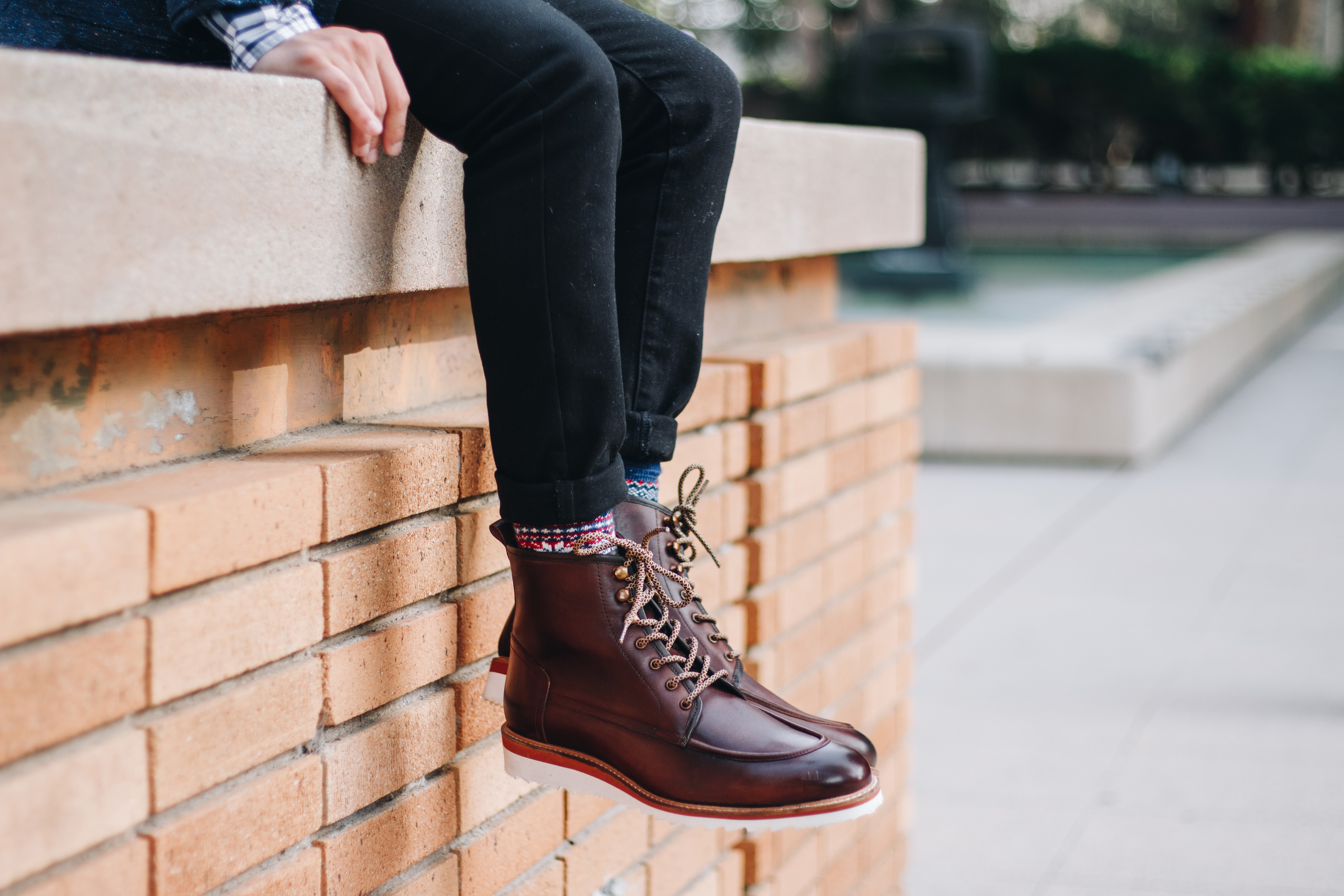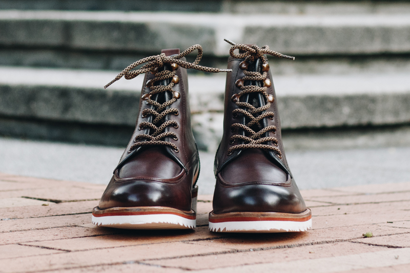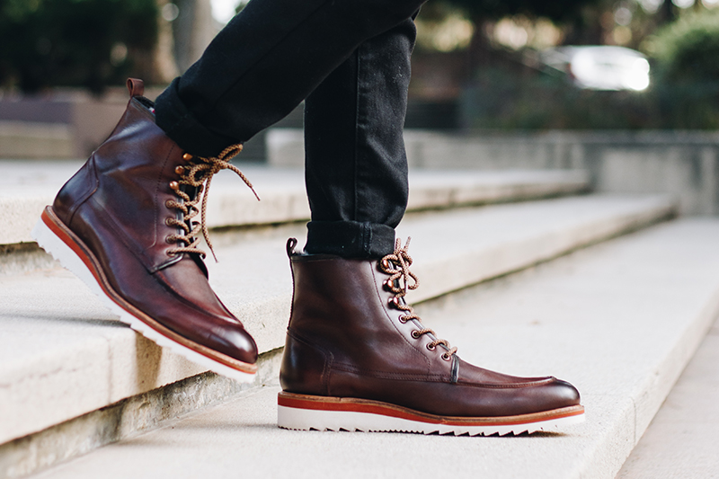The Jimara arrives in a beautiful dark brown leather upper that sits on a contrasting white rubber outsole. A moc toe, topstitched detail, a back pull tab and lace-up closure with speed hooks complete the sleek rugged look. The faux fur lining was a welcomed surprise that tucks beneath your jeans and makes for a comfortable experience. You will also find leather lining for a classy look that’s also very comfy. However, one of the most important details to note is the prized Goodyear welt construction for water-resistance and to let you resole your boots if needed.