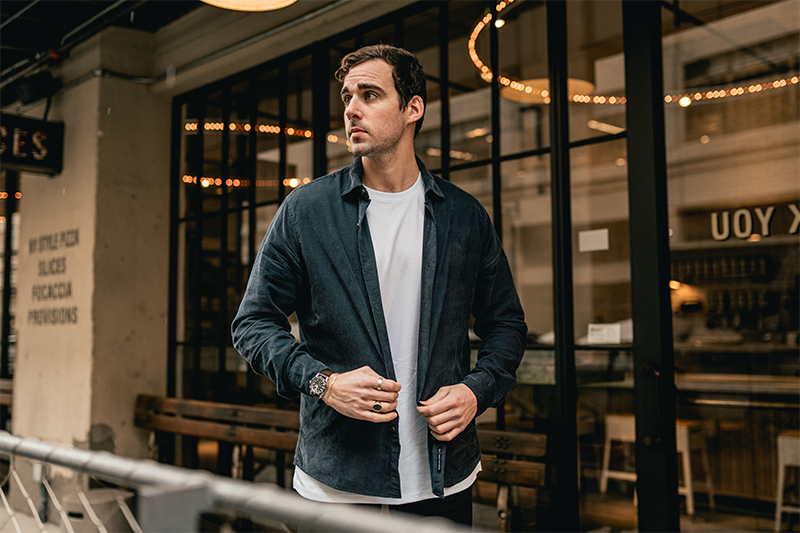 The first of the two looks features The Barakett Tee, a classic white shirt that’s made from 100% Pima cotton. It’s incredibly soft to the touch, which makes wearing it a no-brainer. You can wear it on its own during the warmer months or throw the Edsworth Long-Sleeve Shirt on top of it. This corduroy shirt is available in two different colors, including our favorite, navy. While Corduroy, might be having a moment, we don’t see it going anywhere and are happy to have it in our rotation for 2024. Like Robert Barakett’s signature tee, it’s also super soft, comfortable, and won’t weigh you down. You won’t want to take it off. Completing the outfit are slim black denim, brown leather boots, and some accessories to tie everything together.