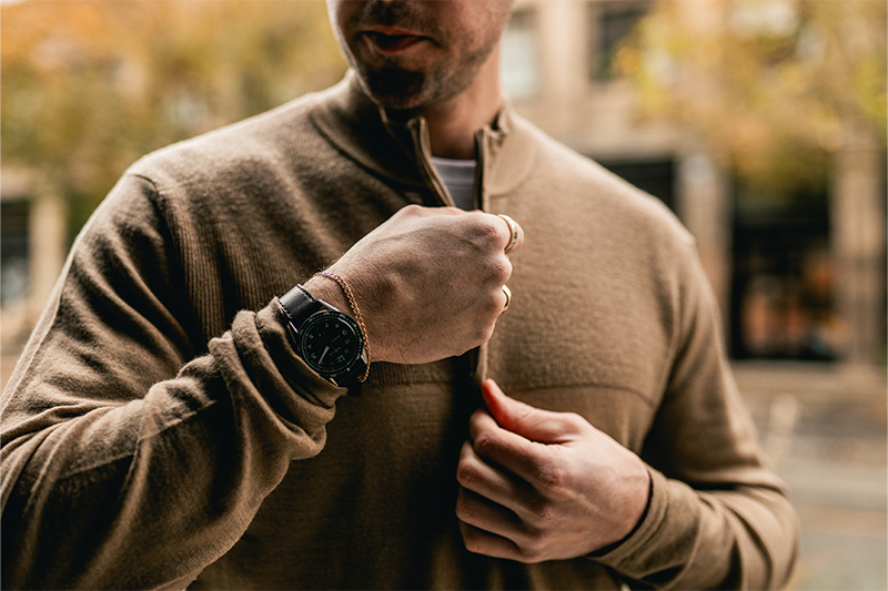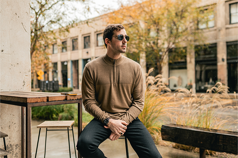 The second outlook mirrors the first to show how easy it is to transition from day to night simply by swapping out one article of clothing. We keep everything in tact, from the white tee to the black jeans, boots, and accessories. However, it is the cozy Newbury Zip Sweater that we throw on top. Go from casual to a more dressy look with this extra-fine 100% Merino Wool sweater. It has that classic half-zip sweater silhouette, but the tan color and construction allow you to wear this outfit in a more formal setting, like at a nice restaurant or drinks at the bar. Choose from a handful of colors, with each adding sophistication to just about any outfit. Conveniently, the Newbury Zip Sweater is on sale, and you can save 40% off by purchasing it before it sells out.